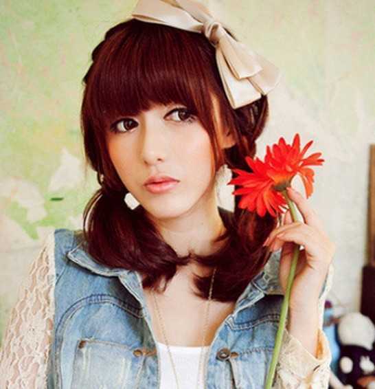 十分养眼的棕红染发,也是时尚潮流的最好标志,在微卷的中长发,融入低扎的马尾,无疑多了几份精灵淑女的感觉,整齐的刘海搭配顶部大蝴蝶结的发饰,更是为甜美大下了很好的基础。