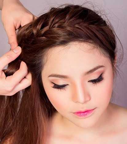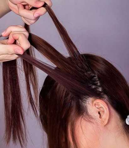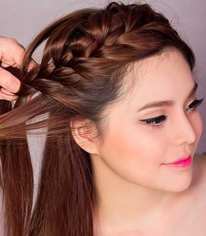 步骤二:一边编就一边加入头发,一直编到另一侧,打造出花环的效果。