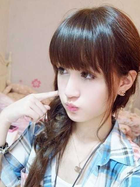 长发集中于一侧扎出松散的发辫垂在肩上,显得少许的优雅和温柔感,搭配长至眼帘的齐刘海发束,营造出十分好看可爱的韩系范!