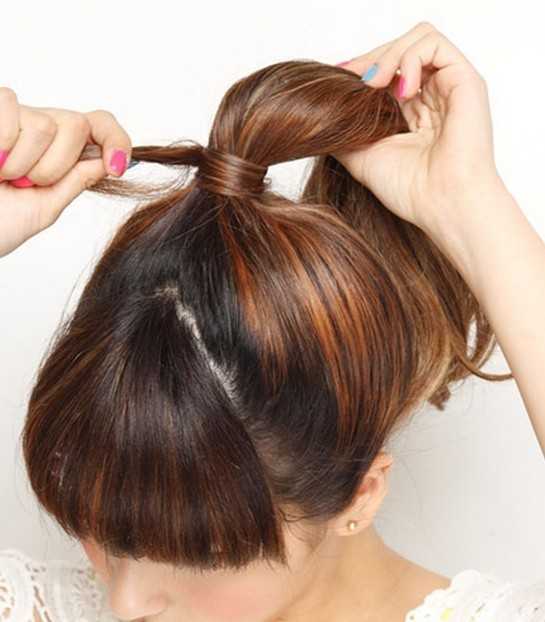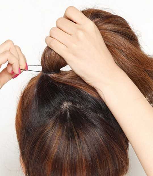2、然后取出一小束头发把橡皮筋围绕隐藏起来,而发尾使用橡皮筋固定即可。
