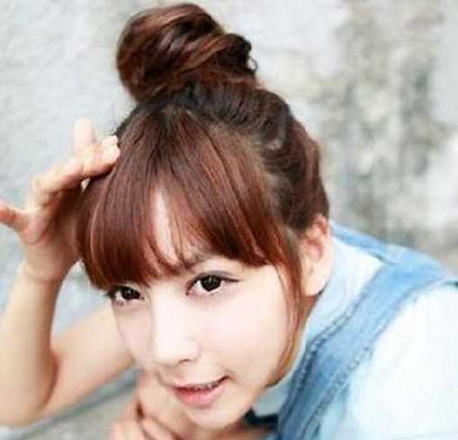 精灵可爱的韩国妹子,花苞头无疑就是最显甜美的法宝了,高扎的发髻搭配碎薄刘海设计,给人足够的清新迷人感。