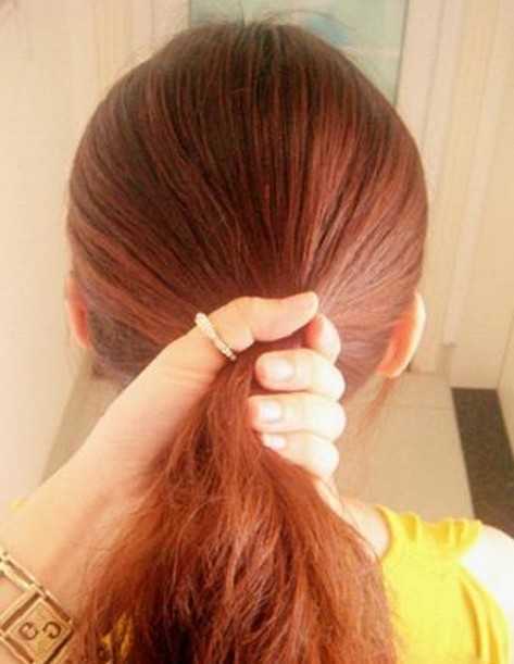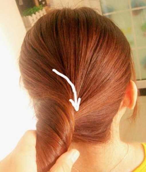 5、再用食指将盘好的发股按压住,侧其余发丝可向左侧自然散开,然后使用小夹子从右上方向左下方插进发股里固定好位置。