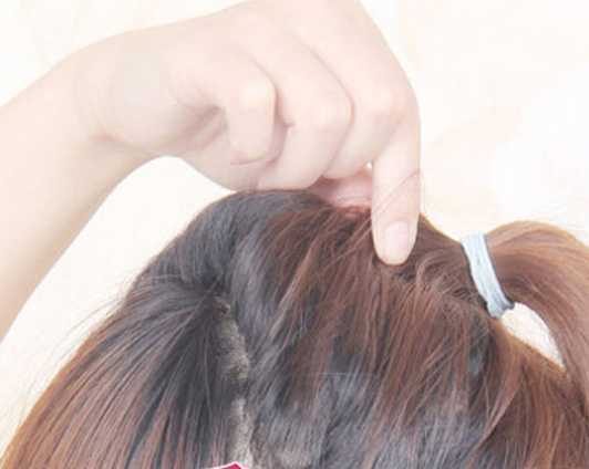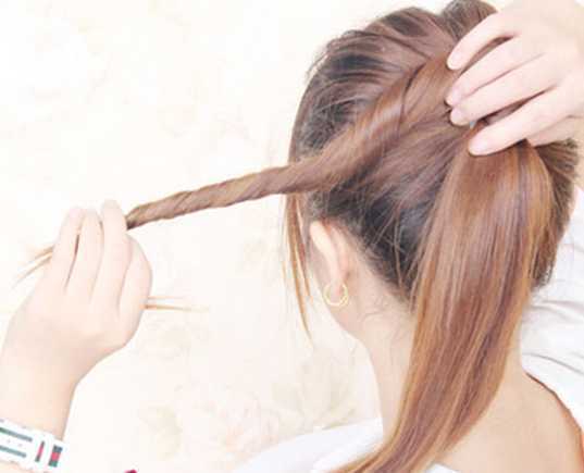 3、再将马尾分成两份,把其中一份顺着方向扭转起来,然后顺时针围绕马尾根部一圈固定好。