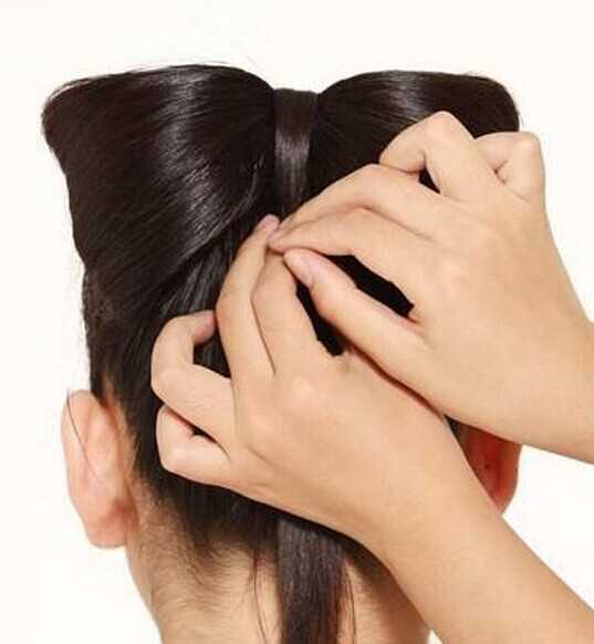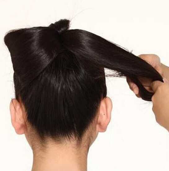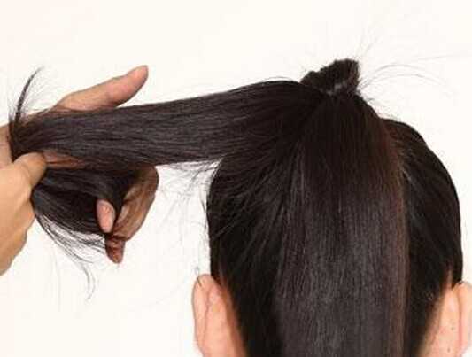 6、接着将刚才留出来的一束头发往下拉,这样用来遮住发结的位置。