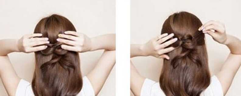 2、然后从左右两侧取两束头发,再扭转出蝴蝶结的形状并用夹子固定好。