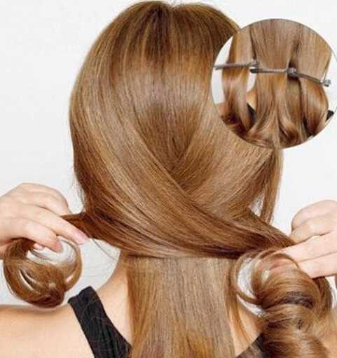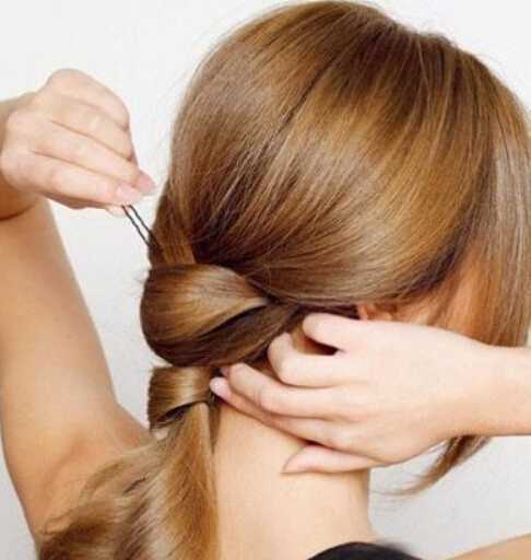 4、接着再右边的那束头发拉向左上发,同样固定之后,将发尾藏入头发中。