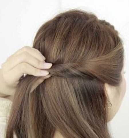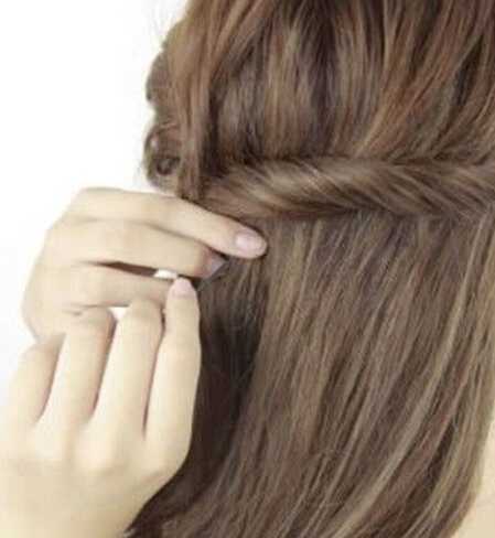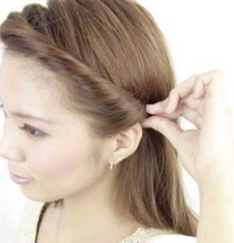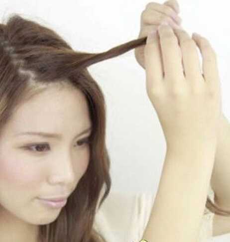 1、先从额头刘海出挑取少量发束,然后往后扭转起来。