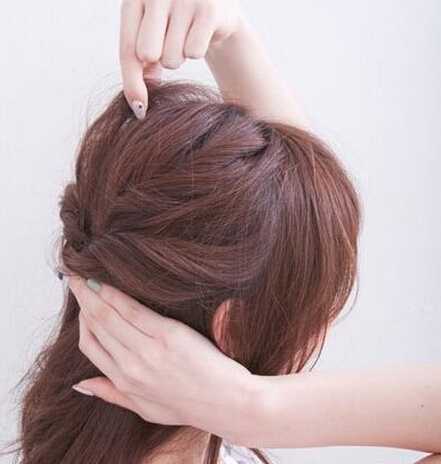 步骤四:再从脑袋后面抓起一撮头发同样得进行扭转成发辫造型
