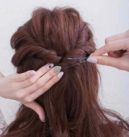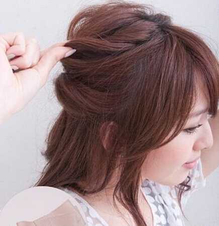 步骤六:固定好发辫后,把头顶的发丝拉扯蓬松些。
