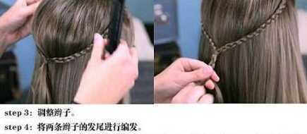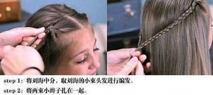 tips1:将头发梳理好,刘海中分,然后开始编辫子,如图所示,取前面的刘海一侧编一条麻花,编到一定的长度,将两束小辫子扎在一起,刚刚好就可以了,不能太松也不能太紧。