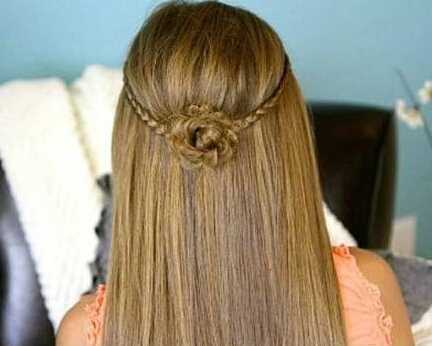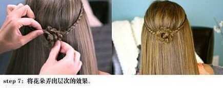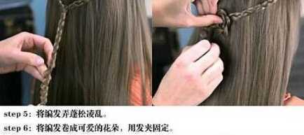 tips3:编至发尾用橡皮筋扎好,然后再稍微调整一下,将编发弄得蓬松一点,接着将下面的编发围着中心卷成可爱的花朵,最后再用发夹固定一下。