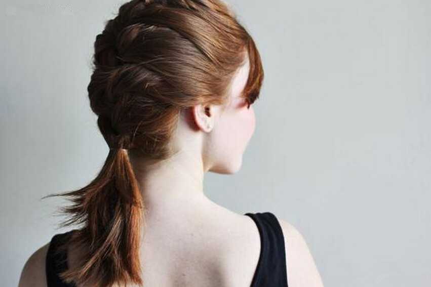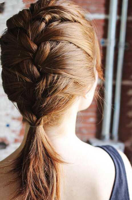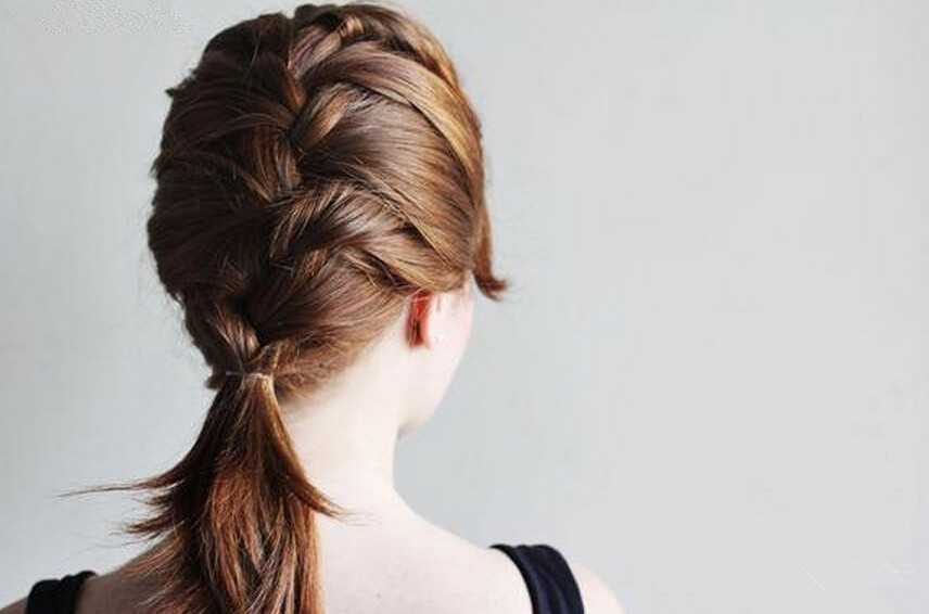 步骤四:一直编织至发尾处,记得也将下部分的头发都添进编织的辫子里,用皮筋将头发扎好,并将辫子拉扯松散一些。