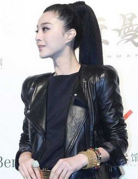 女神范的冰冰高高马尾一定要试试!全部头发高高扎起,一束小发丝在权当发圈缠绕着马尾,完美展现迷人轮廓,搭配帅气耸肩机车皮衣、精致的首饰,十分帅气女神范哦!她的女人味一直吸引众多GG的眼球哦!