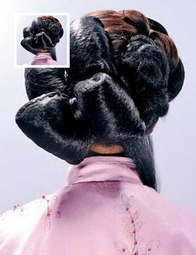 步骤五:最后就是把两个用假发做成的蝴蝶的假发装在头后面就完成啦。