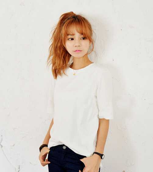 1、透着空隙的空气刘海,呈内弧状,修饰脸蛋,两侧的发丝修颜显可爱,而重头戏是后面的高马尾扎发,蓬松的发丝带点凌乱感,极具韩式俏皮可爱感。