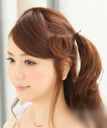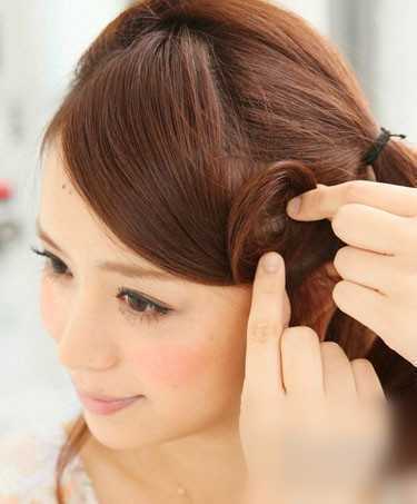 步骤一:首先将头发沿着耳朵高处分成上下两区,把上面的头发在左边的地方扎一个马尾,将刘海往上方缠绕一圈,做成一个圈圈的图案,调整好刘海前面的弧度。
