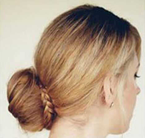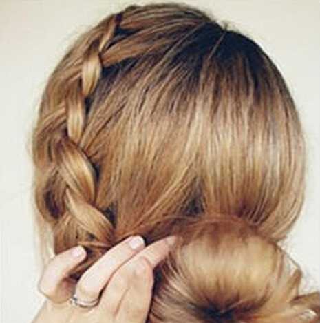 step8、将海棉发圈移至发尾,将发尾的头发绕着发圈一圈,然后海棉发圈从发尾往发根卷,卷至发髻贴着后脑勺的头发,用小发卡固定,接着将之前编好的麻花辫绕着发髻,绕完也是用发卡固定。