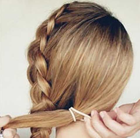step4、编至发尾,用橡皮筋固定,然后用手轻轻的将这条麻花辫拉松,注意这条辫子只在一侧编,不要将另外一边的头发都放进来编;