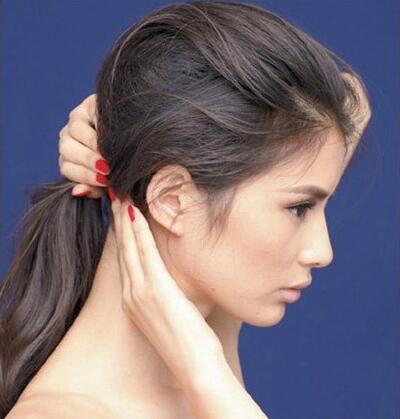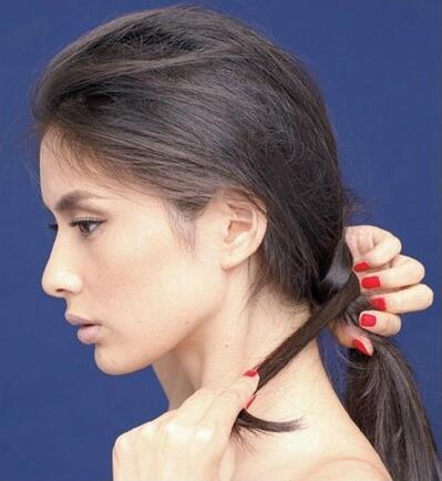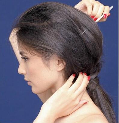 第三步》》》抽出一缕秀发在脑后下方的位置扎起马尾,如此会让发根的部位扎起来,让后脑秀发的线条自然饱满。