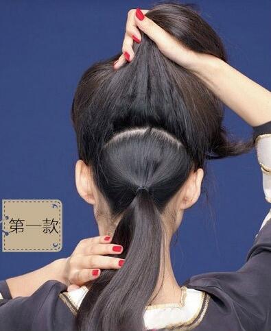 第一步》》》把头发梳好后,把前面的头发往后梳,分成上下两部分,下部分扎着一个简单的马尾。