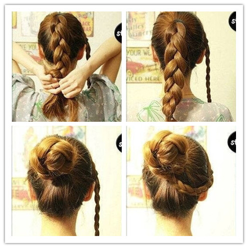然后把侧边的麻花辫慢慢地顺着花苞头的形状卷起来,用橡皮圈和一字夹进行固定,侧边的麻花辫大可不必卷得过于紧,稍显蓬松的感觉最好。
