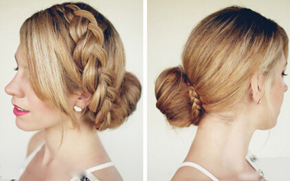 韩式发型扎法05》》》》》最后,将编好的麻花辫围绕着花苞头卷成一圈,用一字夹固定即可。