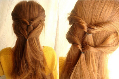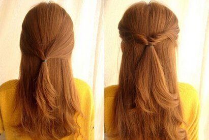 公主头扎发step4》》》》》然后,使用与步骤二同样的方式将半扎发反转处理好,再拉紧皮筋,避免秀发过于松落。