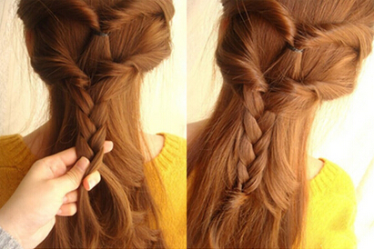 公主头扎发step5》》》》》接着将半扎发进行麻花辫的编织,一直编到发尾后固定即可。