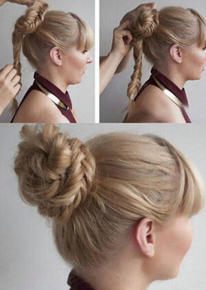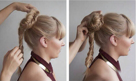 【蜈蚣辫花苞头step05】然后,用手固定其中的一条麻花辫,另外的一条则缠绕发束结点处,缠绕成一个花苞的形态后固定,另外的一条蜈蚣辫也是重复同样的步骤操作即可。