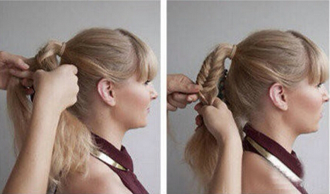 【蜈蚣辫花苞头step02】将马尾中的秀发分成上下两部分,然后将上部分的秀发分成三股,然后将其编织成精致的蜈蚣辫。