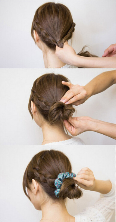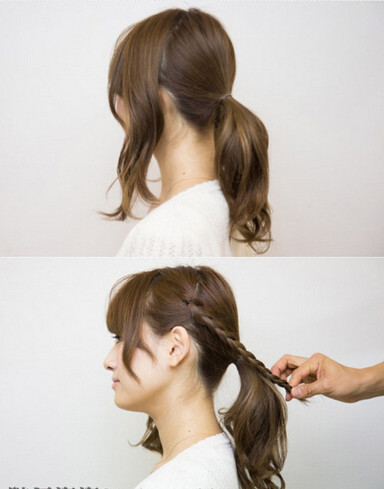 【花苞头教程step03】然后,将麻花辫和马尾用一次性的橡皮圈固定,固定之后,同样轻扯拨松整个发型。