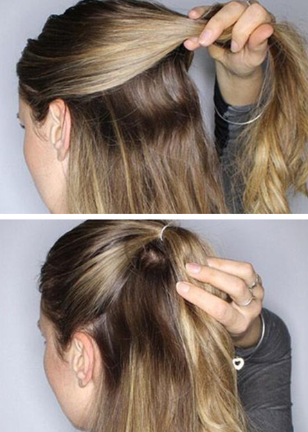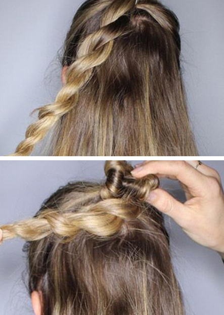 然后将马尾一分为二,让两个发束交叉缠绕,变成一条辫子,使用橡皮筋绑好发尾。接着我们可按照图右所示,将辫子围着发根缠绕起来,形成一个花苞状。