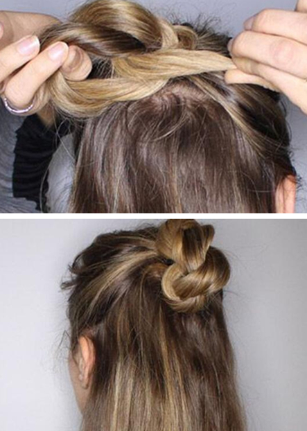 将发辫缠到最后,我们可将发尾穿过花苞头的空隙中,然后拉近打结,使用发夹固定好头发即可。