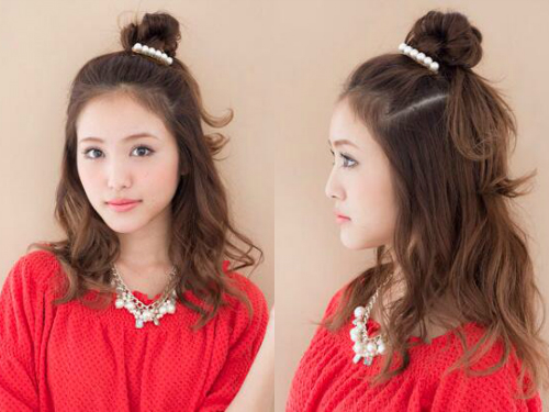 这是一款既趣致又有女人味的半扎花苞头发型,仅取发顶的头发扎成蓬松的花苞头,然后留出卷翘的发尾,给人相当活泼俏皮的感觉,最后以白色珍珠发饰固定头发,成功带出你的女人味。
