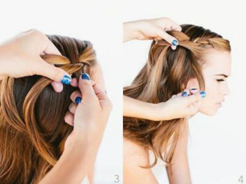 从侧边开始编三股辫,编发的同时不断加入发顶的头发,并将发辫缠绕后脑拉向另一侧。