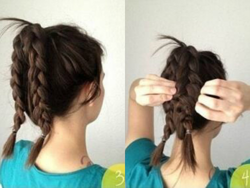 将马尾平均分成两部分,然后编成两条麻花辫,再用手拉扯两条发辫,让它们变得更加蓬松显饱满。