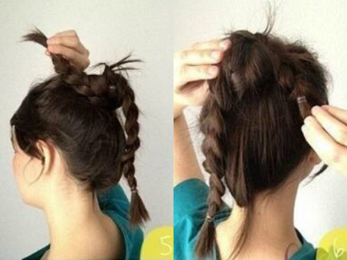 先将其中一条麻花辫缠绕着马尾根部盘起,呈现半花苞状,尽量将发尾藏在下面,如果头发过于松散,可用小发夹固定好。