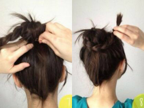 按照上述方法,将剩下的那条麻花辫缠绕在已经盘好的发辫上,变成一个完整的花苞头。