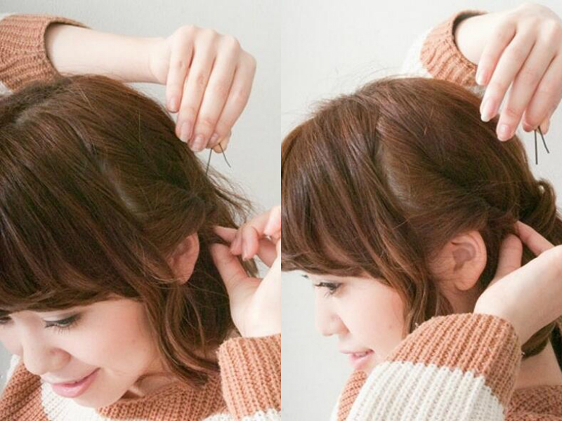 step2:把选取出来的发束直接向后扭转,扭转成发辫后用一字夹固定在耳后,如果你担心不够稳固可以多夹几个发夹。