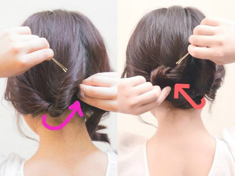 然后将扎好的发束沿着箭头指示的方向,从下往上提拉发束,然后用发夹将头发固定起来,另一边的发束也是同样的处理,从下往上越过中间的分界线,用发夹将它固定在头发上。