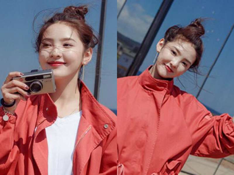 美少女们最喜欢的丸子头,在浪漫的秋天当然也少不了。头发随意地梳理好绑成一个丸子立在头顶就可以了,发丝间尽量整理出蓬松感,这样看起来会自然很多,扎不起来的碎发就随它随风飞扬吧,因为可以展现出女生不拘小节、自由随性的一面。