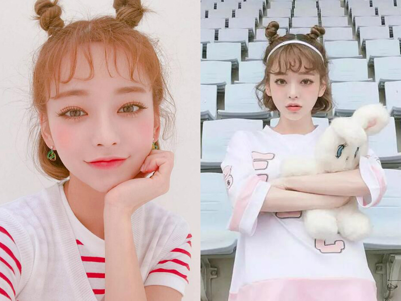看起来异常趣致的两个小丸子扎在妹子头上显得超活泼,余下的齐耳短发紧贴脖子,看起来干爽利落,轻薄透气的微波卷刘海悬挂在额前,额头若隐若现之际展现出妹子完美的鹅蛋脸,搭上一个发箍装饰,可爱又显嫩。