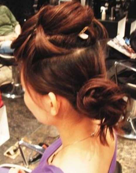 将后面剩下的头发拿起并且扭转缠绕到左边,再将发尾藏在发梢里面。