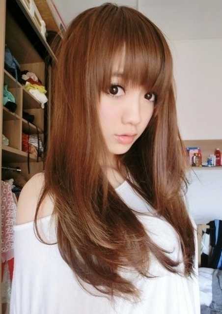 齐刘海和直发搭起来好可爱哦,眼睛显大了有木有,粉嫩的感觉,太可爱了,黄棕色的头发,有点蓬松感,随性自然的感觉,好可爱哦。