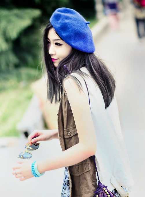 中长直发,修饰脸型的中分带着一种随意感,搭上帽子,