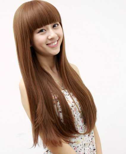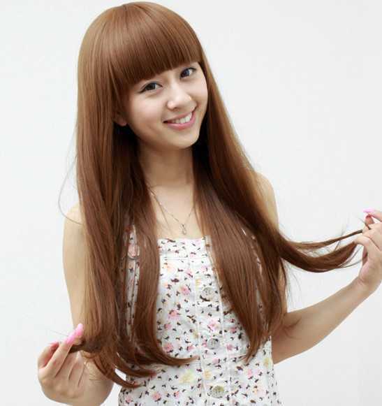 长长的一头有点黄又有点棕发色的头发散落在肩上,好淑女哟!韩式风格,简单又自然,真美!齐刘海看上去很甜美,一个灿烂的笑容足够温暖你的心。
