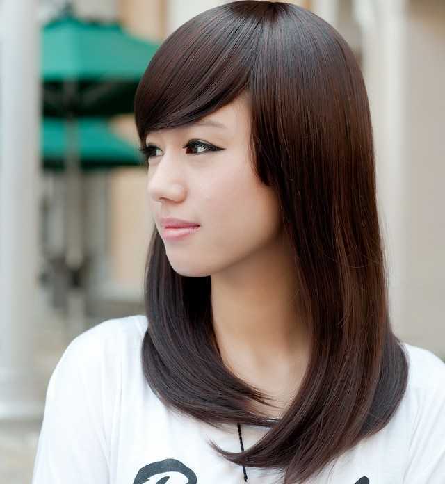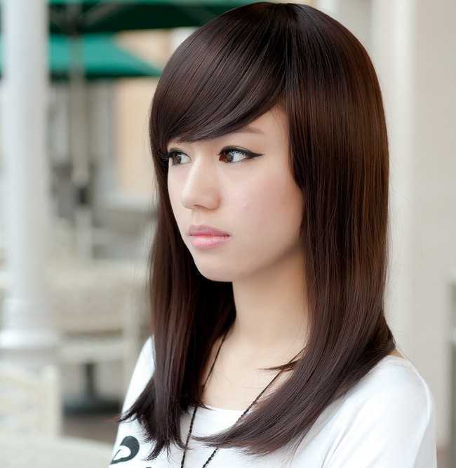 韩版款式设计的中长直发,斜刘海,修脸最佳,而且还很甜美,两颊内扣的发尾不仅彰显出俏皮感,还十分时尚,深棕色的发色很流行哟!