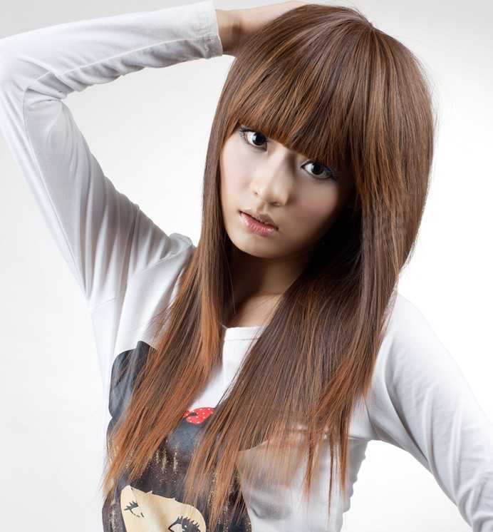 可爱系列的长直发,齐齐刘海,展现出甜美一面,两颊长长的头发,经过染色后,增添了时尚潮流感,简单又不失时尚的一款2013韩式发型,必定成为众女生们的追捧。