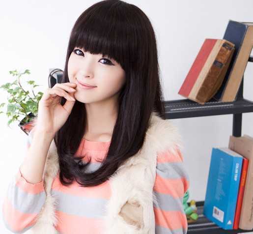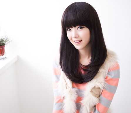 中长款的齐刘海梨花头发型,前面是修齐的刘海,最为甜美,两颊内扣发尾,有着最佳的修脸效果,逐一打破大饼脸、圆脸哦!还十分减龄!