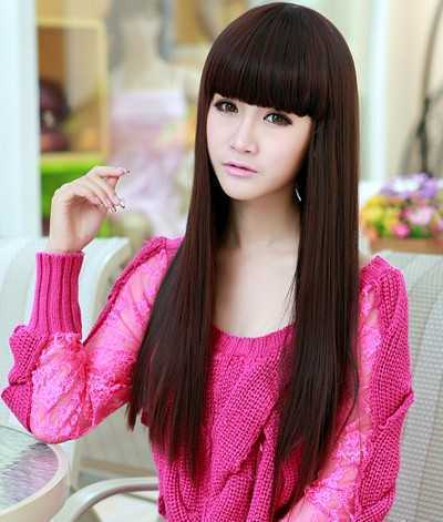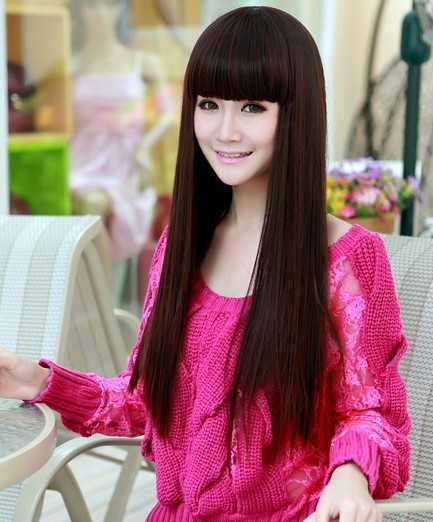前面齐刘海看起来超甜美的,两颊长直发很柔顺的搭在肩上,多了一种淑女感,深棕色的发色衬托着超美的!很时尚!